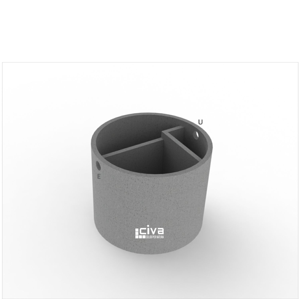 Manufatti in cls vibrato armato di forma circolare. Consentono la separazione ed il recupero degli olii e grassi in genere derivanti da stazioni di servizio, autolavaggi, officine meccaniche in genere e piazzali adibiti a parcheggio.