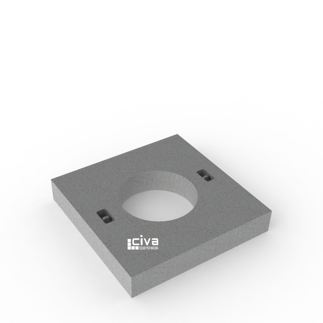 Solette quadrate, di calcestruzzo vibrato armato, realizzate con cemento grigio ad alta resistenza e inerti selezionati. Il posizionamento sopra pozzetti e prolunghe consente la copertura con carrabilità e l’ispezione mediante foro circolare passo uomo.